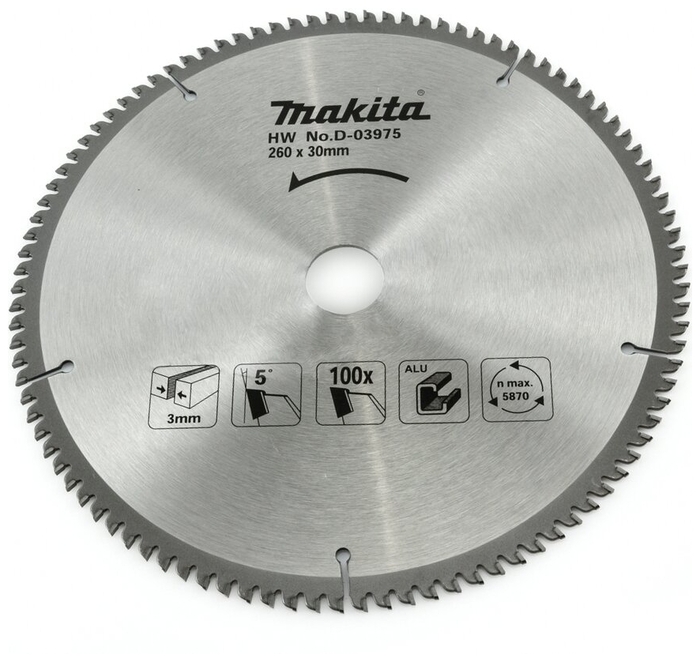 Пильный диск для точной и аккуратной распиловки цветных металлов. Идеален для работы по алюминию. Подходит для резки пластика и ламината. Применителен в качестве рабочей насадки с пилами Макита LS1013 и LS1040. Внешний диаметр – 260 мм. Число зубьев – 100. Их наклон - 5º(отриц.). Диаметр посадочного отверстия – 30 мм. С переходным кольцом – 15.88 мм. Ширина пропила – 2.3 мм..