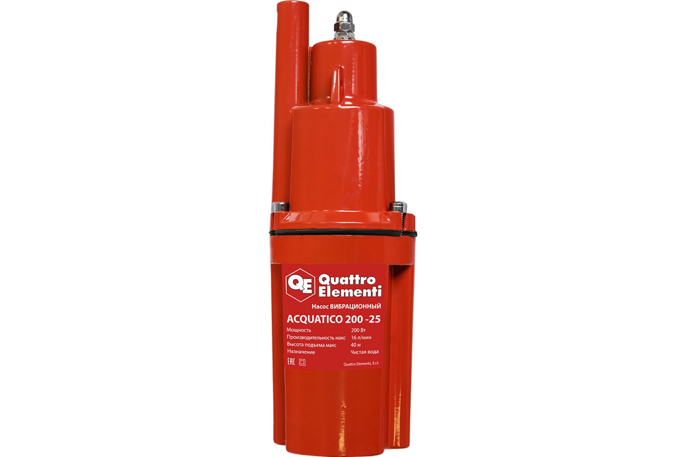 Вибрационный насос QUATTRO ELEMENTI Acquatico 200. Насос позволяет качать чистую воду из различных источников – колодцев, скважин и всевозможных водоемов. Данная модель снабжена верхним забором воды, в связи с чем, расстояние от дна до заборного отверстия не превышает 50 см. Насос можно погружать на глубины от 2м, это позволяет качать воду из неглубоких водоемов и скважин. Мощности двигателя этой модели насоса 200Вт достаточно, для того чтобы поддерживать давление в 6Бар при производительности 960 л/час. Максимальная высота подъема воды составляет 40м..
