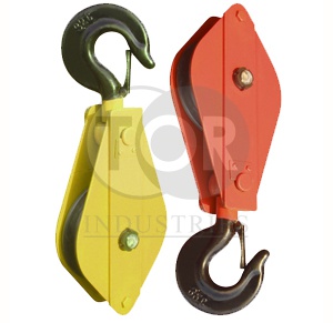 Блок монтажный с крюком активно применяется в промышленной сфере для изменения направления и снижения тягового усилия грузоподъемных механизмов. Монтажный блок состоит из стальных роликовых колес (существуют разновидности блоков с одним роликом и с несколькими роликами), закрепленных на оси вращения между двумя металлическими щеками, и грузового крюка, предназначенного для фиксации груза или самих блоков. Также для удобства запасовки каната монтажный блок имеет откидную щеку. Этим устройством необходимо комплектовать лебедку при осуществлении процесса подъема в случае, если она находится на одном уровне с грузом..
