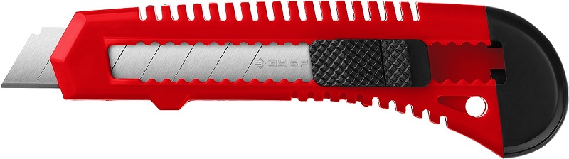 Нож с лезвием ЗУБР 09155_z01, применяется для эффективного разрезания различных материалов: линолеума, ковровых покрытий, гипсолитовых плит, гипсокартона, кровельных материалов, пластика, дерева.