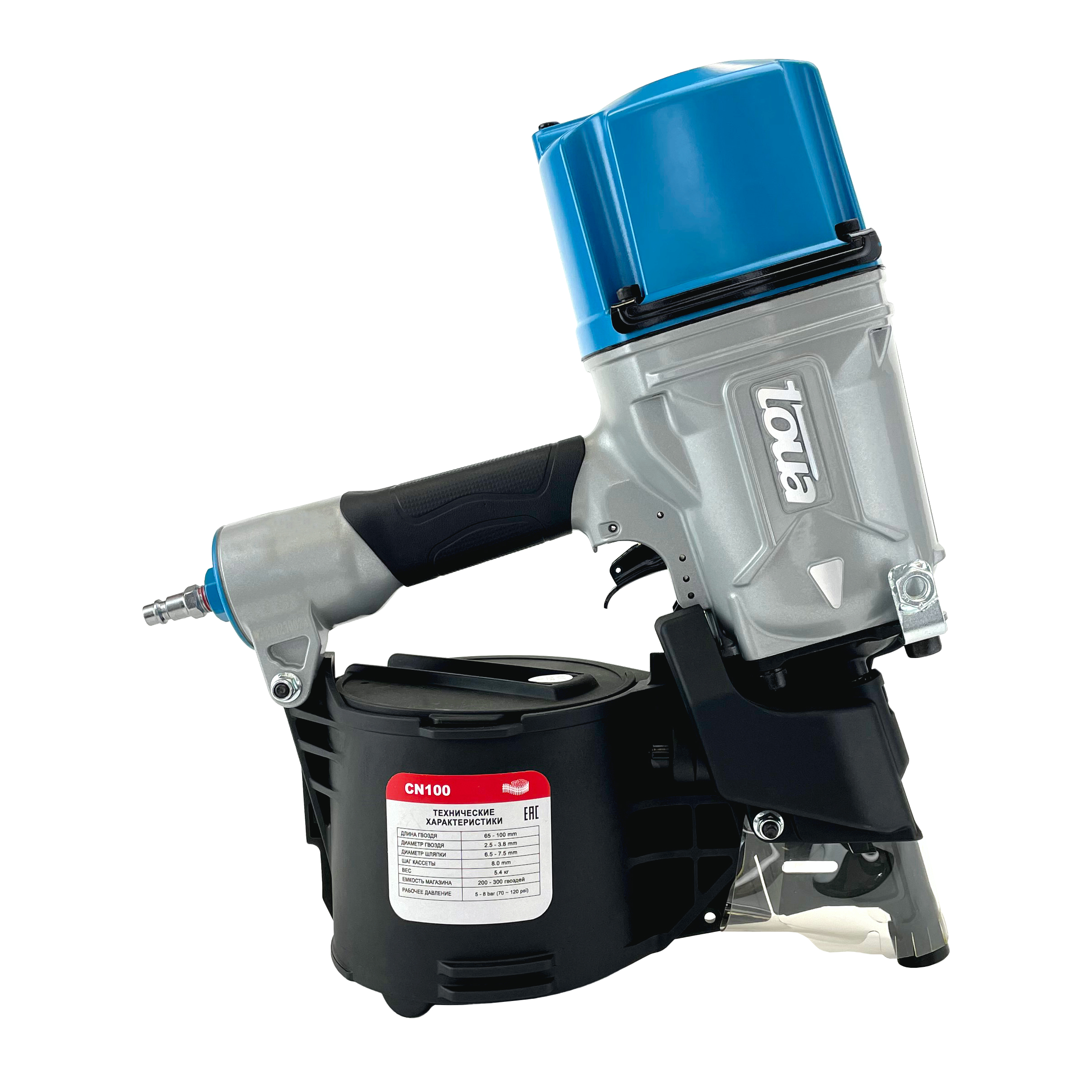 Toua CN100 гвоздезабивной пневматический пистолет барабанного типа работает с гладкими, ершеными и винтовыми гвоздями соединенными между собой проволокой. Обладает высокой производительностью, большим ресурсом и низкой стоимостью точки крепления. Подходит для работ на производстве и конвейерной сборки..