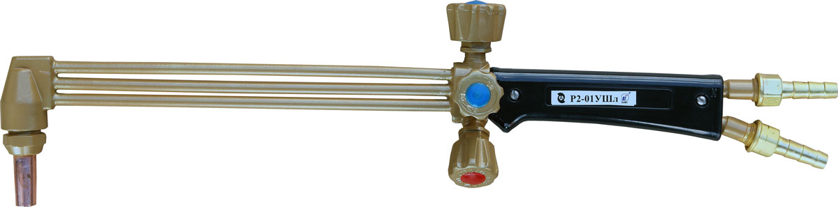 Резак для ручной резки стали Р2-01 УШл П (3-х трубчатый со смешением газов в мундштуке, мундштуки шлицевые) предназначен для ручной кислородной разделительной резки нелегированных и низколегированных сталей до 200 мм с использованием для подогревающего пламени смеси кислорода с пропан-бутаном или природным газом. .