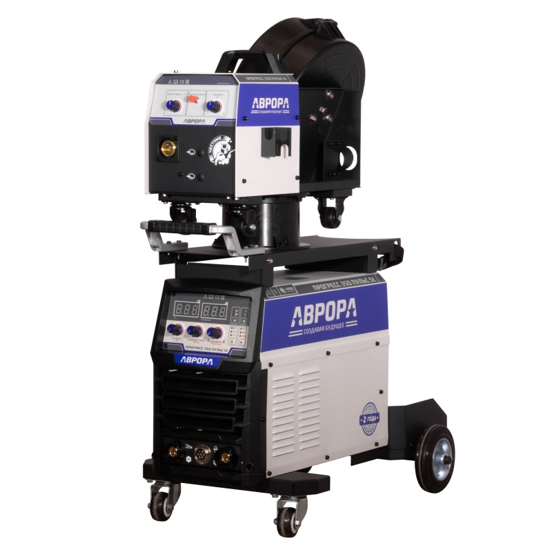 АВРОРА ПРОГРЕСС 350 ПУЛЬС St - 3х фазный инвертор для полуавтоматической сварки в среде инертного/активного защитного газа MIG-MAG и для ручной дуговой сварки штучным электродом MMA. Аппарат выполнен в корпусе "декомпакт" со съёмным подающим механизмом. Рекомендованный тип катушек проволоки D200 и D300 (5-15кг). Мощный подающий механизм предназначен для работы с горелками длиной до 5 метров. Тележка с подставкой под баллон и высокая компоновка аппарата существенно облегчают работу сварщика. .
