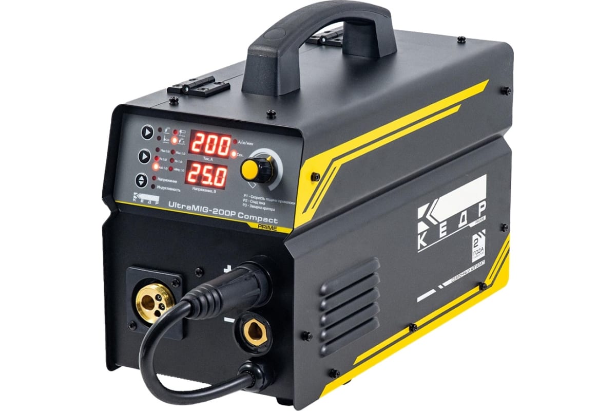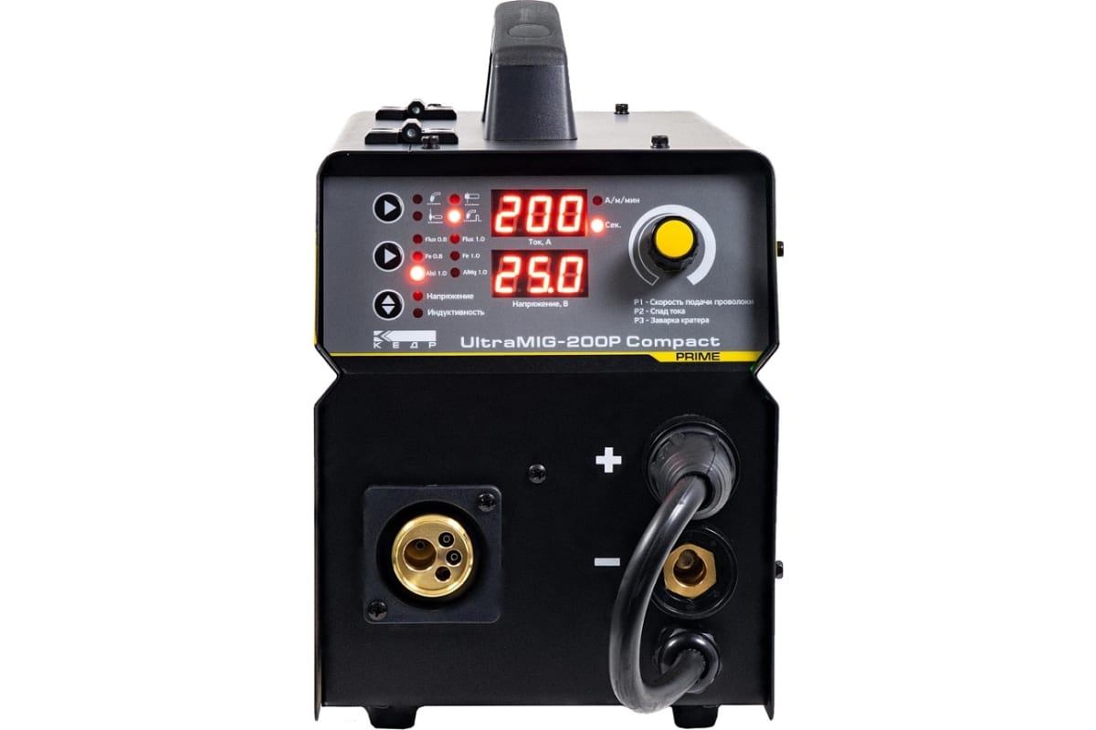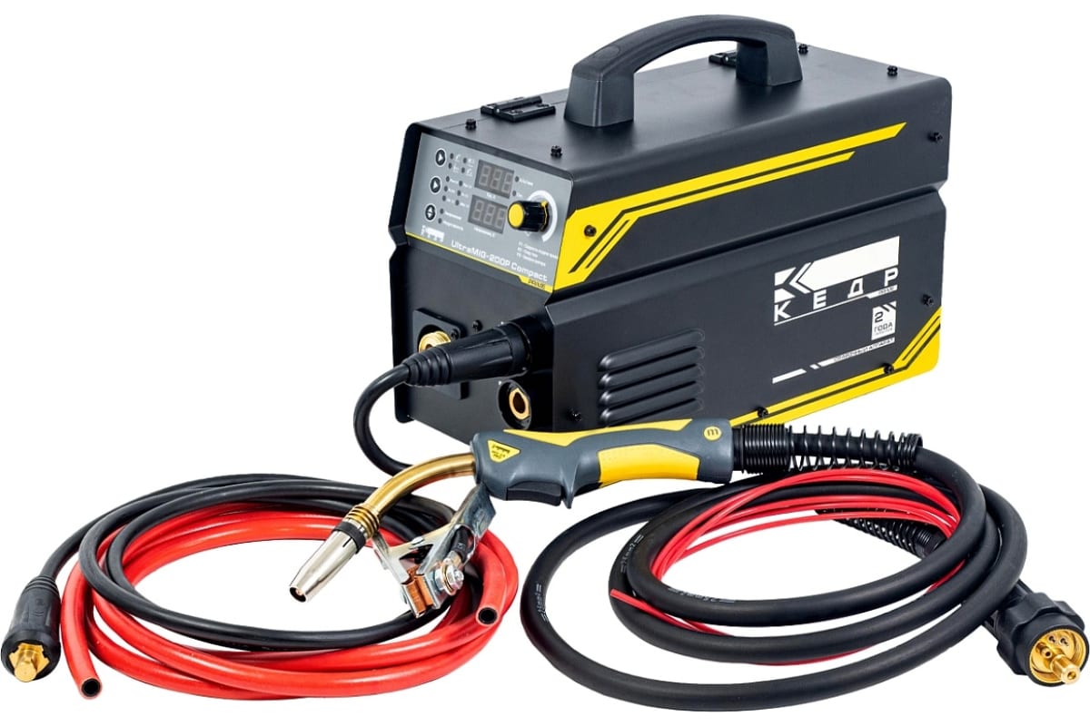 Полуавтомат КЕДР UltraMIG-200P Compact - идеально подходит для сварки на малых предприятиях, автомастерских и бытового использования. Имеет малый вес, прочный металлический корпус и эргономическую панель управления..