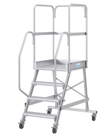 Односторонняя алюминиевая передвижная лестница с площадкой. Широкие ступени, двухсторонние перила и трёхстороннее ограждение площадки.