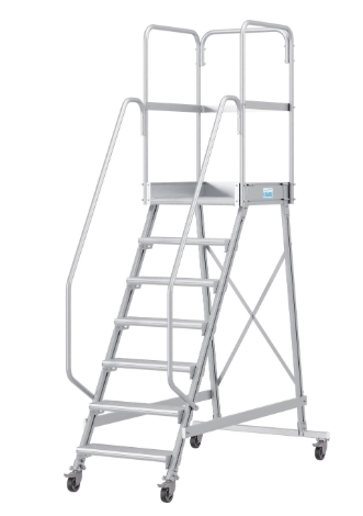 Односторонняя алюминиевая передвижная лестница с площадкой. Широкие ступени, двухсторонние перила и трёхстороннее ограждение площадки.