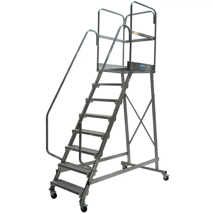 Односторонняя алюминиевая передвижная лестница с площадкой. Широкие ступени, двухсторонние перила и трёхстороннее ограждение площадки.