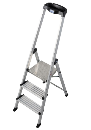 Легкая и комфортная алюминиевая стремянка с высокой дугой безопасности и практичной полкой для инструментов.