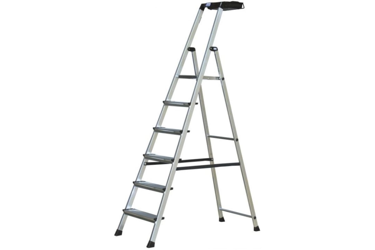 Практичная и универсальная стремянка с большой и удобной полкой, держателем ведра и нескользящей площадкой.