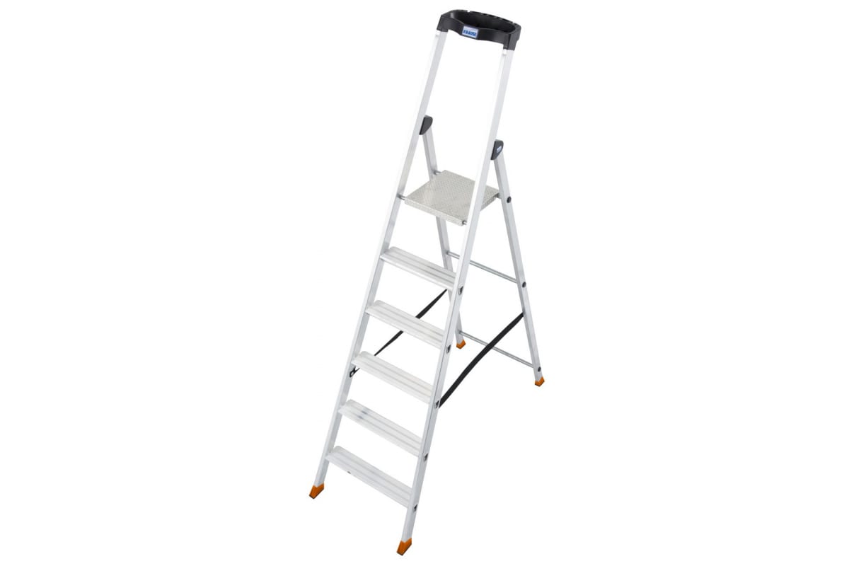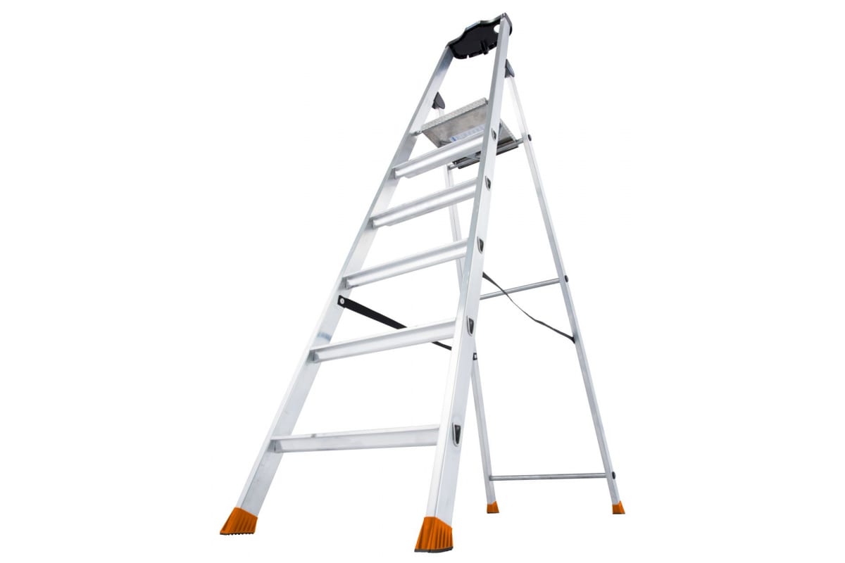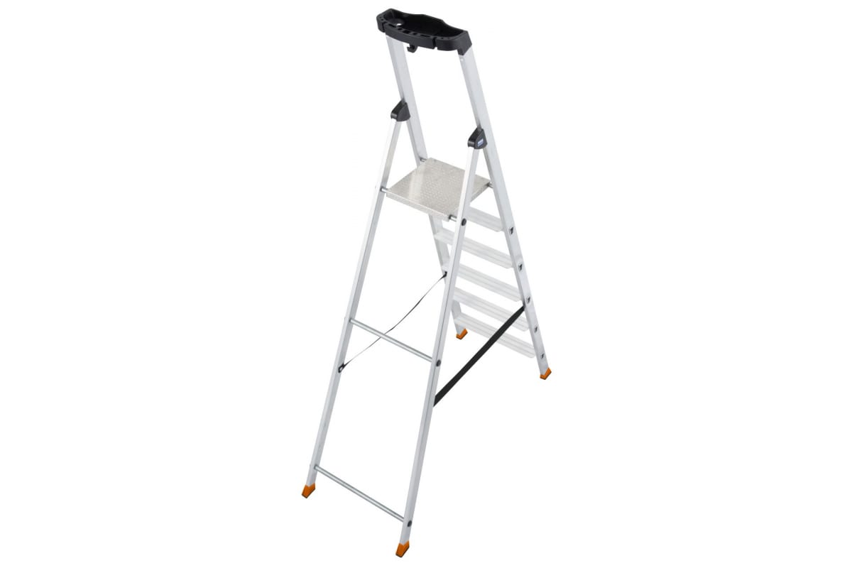 Прочная алюминиевая стремянка с развальцованными ступенями и нескользящей площадкой для многолетнего использования..
