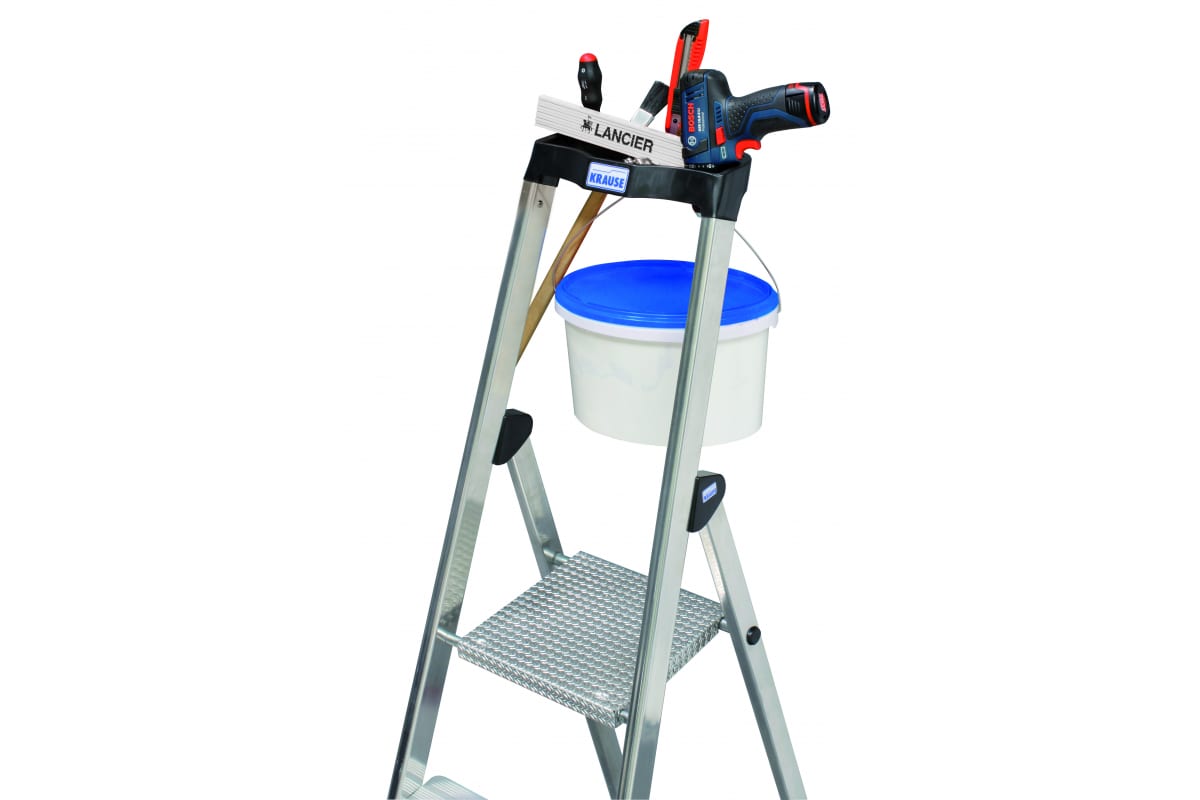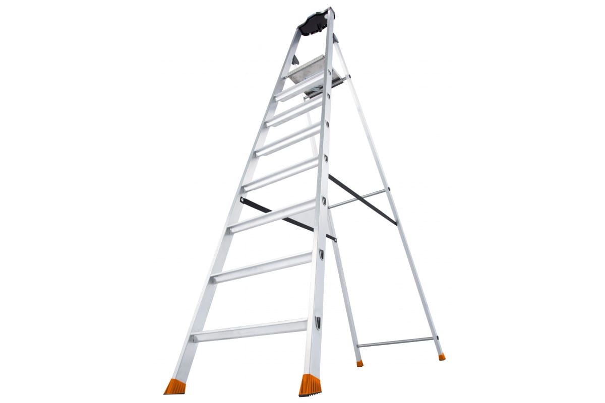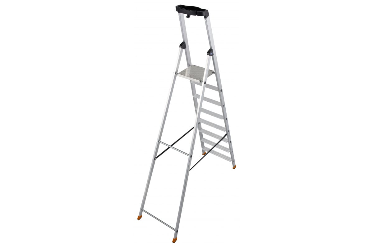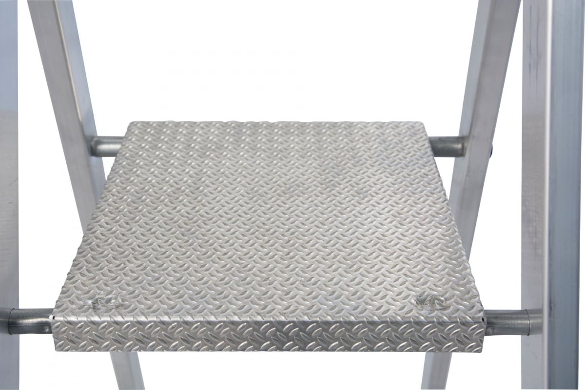 Прочная алюминиевая стремянка с развальцованными ступенями и нескользящей площадкой для многолетнего использования..