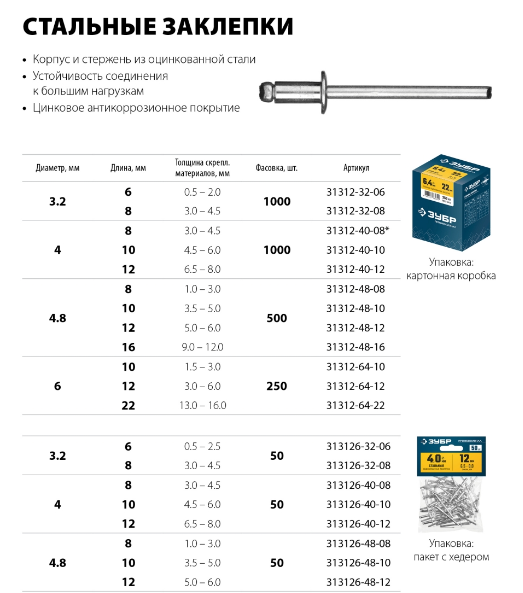 Корпус и стержень заклепки изготовлены из оцинкованной стали, выдерживающей большие нагрузки